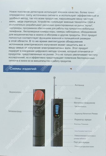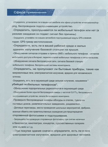 | 2. Технические возможности: | поиск скрытых шпионских мини видео камер, GSM, WIFI прослушки, радио жучков; сигналов и магнитного поля GPS трекеров слежения. |