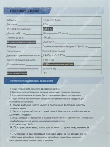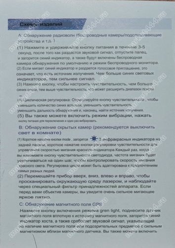 | 5. Режимы работы, поиска: | источников э/м излучения, магнитного поля GPS трекеров, визуальный. |