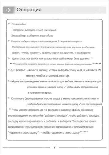 Страница 1/7: список документов; запись: тип PCM/MP3; битрейт; наушники/динамики ВКЛ – ВЫКЛ; регулировка чувствительности микрофона; голосовая активация ВКЛ – ВЫКЛ; таймер ВКЛ – ВЫКЛ; сегментирование, установить длину файла; шумоподавитель ВКЛ – ВЫКЛ; воспроизведение: цикличность, эквалайзер, скорость воспроизведения; управление: удалить файл, удалить папку; режим повтора; время начала; временная метка.